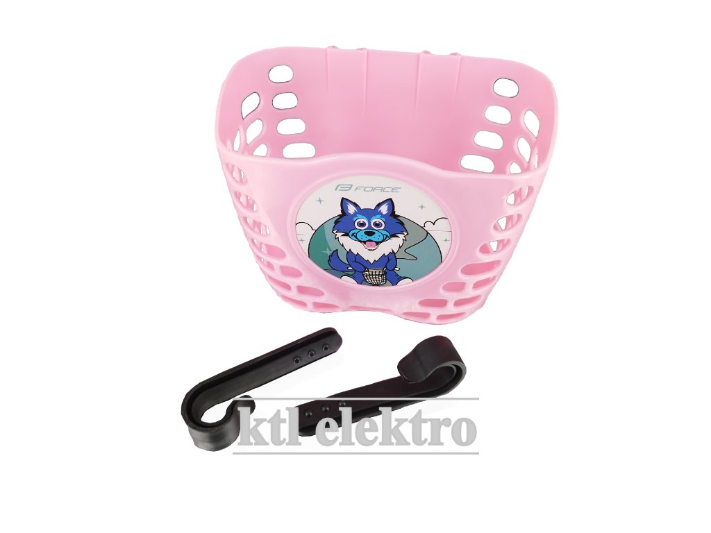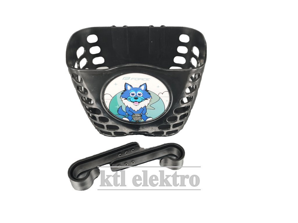 Plastový košík nad přední kolo dětského kola s motivem vlka.