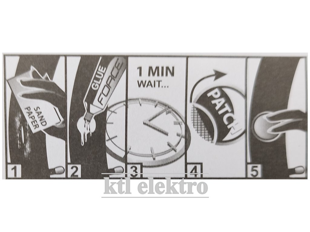 Důkladně očistěte opravované místo smirkovým papírem. Očistěte plochu větší než je záplata. Naneste tenkou vrstvu lepidla a nechte zaschnout. Zabraňte styku očištěné plochy s tekutinami. Po zaschnutí lepidla odstraňte fólii ze záplaty a nalepte na opravované místo. Nedotýkejte se prsty zadní části záplaty. Přitlačte záplatu stiskem, dokud se nepřilepí.